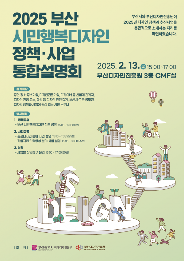 [충청뉴스큐] 부산시는 내일 오후 3시 부산디자인진흥원 3층에서 ‘2025 부산 시민행복디자인 정책·사업 통합설명회’를 개최한다고 밝혔다.