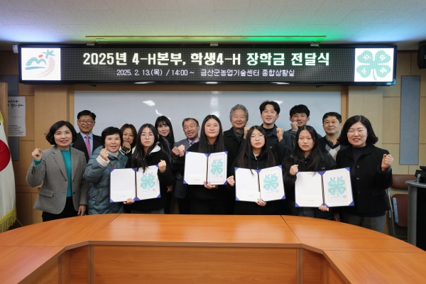 장학금은 금산군4-H본부 기금에서 조성됐으며 성실한 활동과 우수한 성과를 거둔 학생 4-H회원 4명에게 25만원씩 총 100만원을 지급했다.