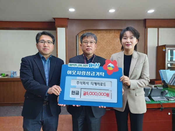 태안군에 따르면, 서산시에 위치한 콘크리트·시멘트 제조 업체인 ㈜디케이로드는 17일 군청 부군수실에서 온은주 대표와 박영준 부장, 이주영 부군수 등이 참석한 가운데 기탁식을 갖고 성금 500만원을 군에 기탁했다.
