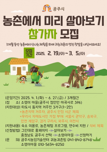 [충청뉴스큐] 공주시는 예비 귀농귀촌인들이 농촌을 체험하고 이해할 수 있는 ‘농촌에서 미리 살아보기’ 프로그램 참가자를 오는 3월 5일까지 모집한다고 20일 밝혔다.
