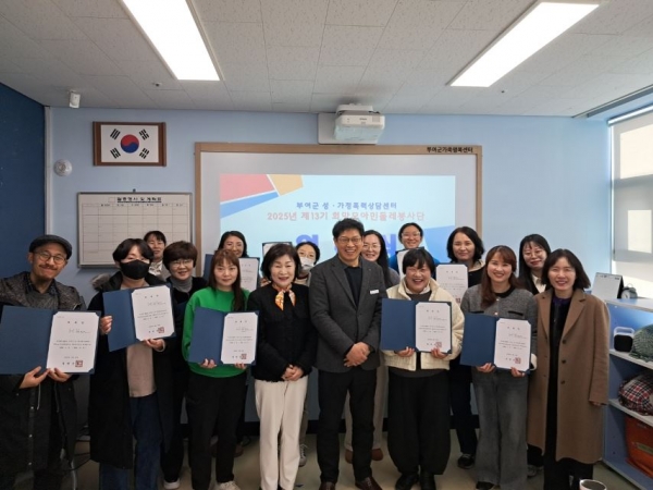 [충청뉴스큐] 부여군은 지난 19일 부여군 성가정폭력상담센터에서 새롭게 구성된 제13기 희망모아민들레봉사단의 14명 자원봉사자에게 위촉장을 수여했다.