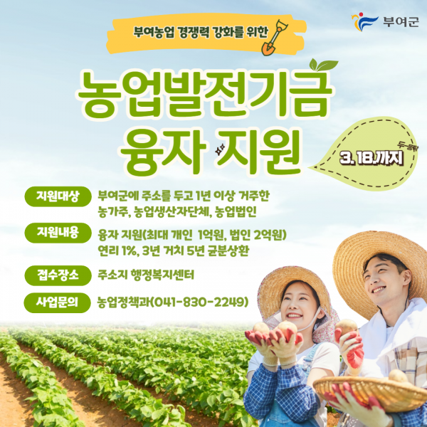 [충청뉴스큐] 부여군이 이달 18일까지 농업발전기금 융자지원 사업의 대상자를 모집한다.