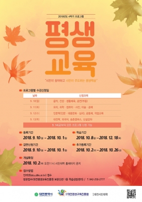 [충청뉴스Q] 대전평생교육진흥원은 오는 10일부터 10월 1일까지 대전시민대학 2018년도 4학기 수강생을 선착순 모집한다.
