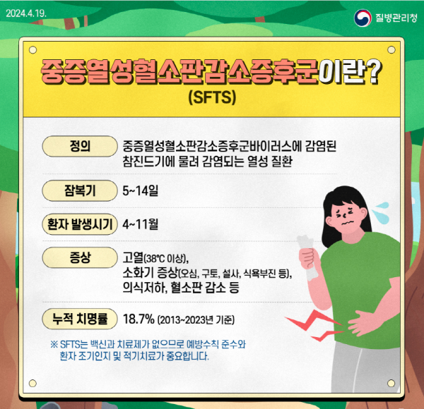 중증열성혈소판감소증후군은 주로 4~11월에 SFTS바이러스를 보유한 참진드기에 물린 후 5~14일 이내 고열, 소화기증상 등의 증상이 나타난다.