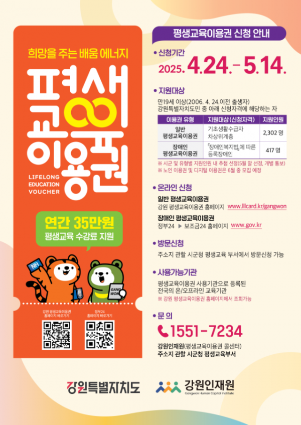 ‘강원특별자치도 평생교육이용권’ 사업 신청 기간은 4월 24일부터 5월 14일까지다.