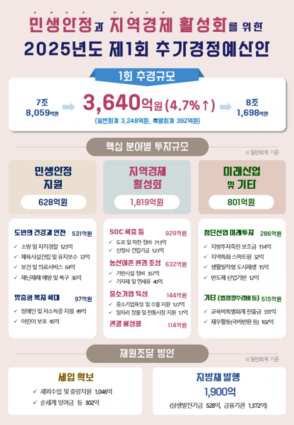 이번 제1회 추가경정예산안은 민생 안정과 지역경제 활성화 사업에 중점 투자했고 첨단산업 등 미래투자에 286억원 및 법정 필수사업 등에 517억원을 편성했다.
