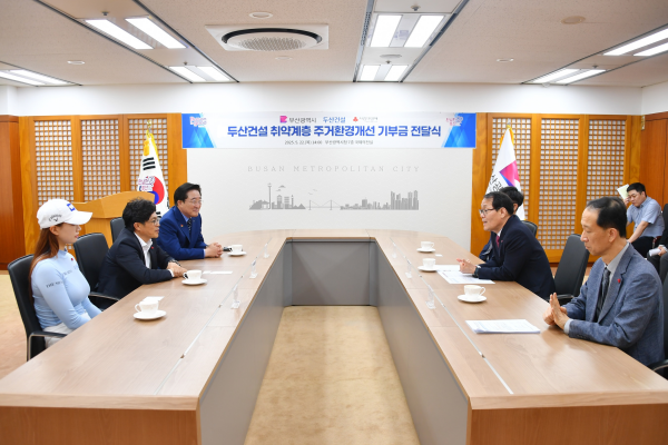 [충청뉴스큐] 부산시는 어제 오후 2시 시청 국제의전실에서 두산건설 취약계층 주거환경개선 기부금 전달식을 개최했다고 밝혔다.
