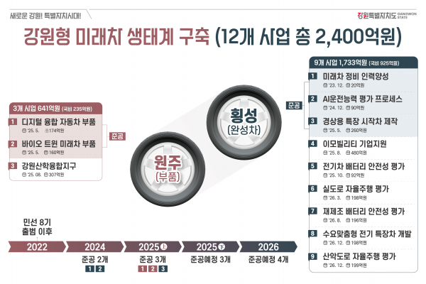 도는 원주와 횡성을 거점으로 총 2,400억원 규모의 4대 전략 12개 사업을 추진하고 있으며 이를 통해 자율주행차 실증과 전문인력 양성 기반을 단계적으로 구축하고 있다.