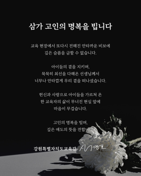신경호 교육감은 이날 추모 메시지를 통해 “아이들의 곁을 지키며 묵묵히 최선을 다해온 선생님께서 너무나 안타깝게 우리 곁을 떠났다”며 “헌신과 사랑으로 아이들을 가르쳐온 한 교육자의 삶이 무너진 현실 앞에 마음이 무겁다”고 애도의 뜻을 전했다.