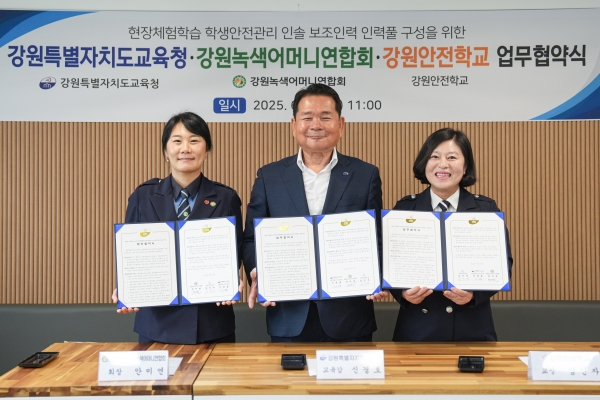 [충청뉴스큐] 강원특별자치도교육청은 16일 11시 강원특별자치도녹색어머니연합회, 강원안전학교와 ‘현장체험학습 학생 인솔 보조인력 인력풀 구축’을 위한 업무협약을 체결했다.