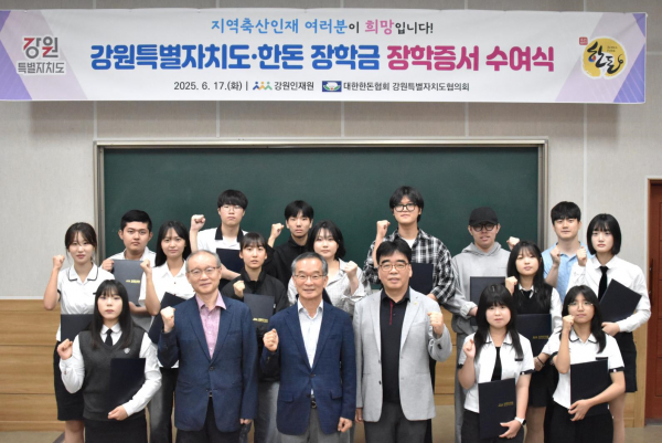 한편 도·한돈 장학금은 2022년부터 매년 강원특별자치도와 대한한돈협회가 각 1,000만원씩 기금을 공동 출연해 운영 중인 제도로 도내 축산 관련 고등학교 및 대학교 재학생을 대상으로 최대 100만원의 장학금을 지급하고 있으며 올해까지 총 100여명의 축산 인재를 선발·지원해 왔다.