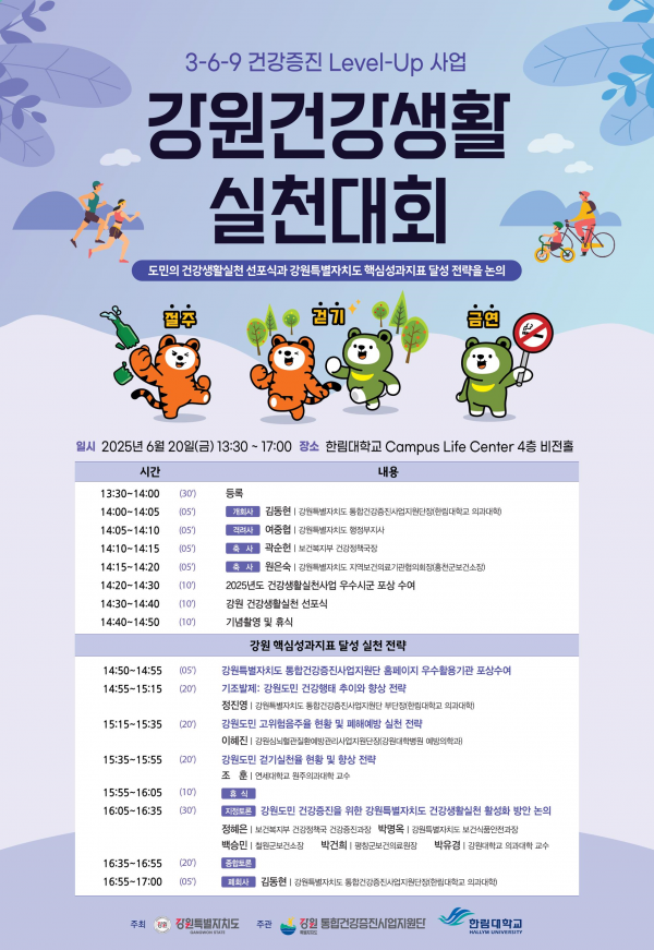 [충청뉴스큐] 강원특별자치도는 6월 20일 춘천 한림대학교 캠퍼스라이프센터에서 ‘강원건강생활실천대회’를 개최하고 건강한 강원 실현을 위한 금연, 절주, 걷기 실천문화 확산에 본격적으로 나섰다.
