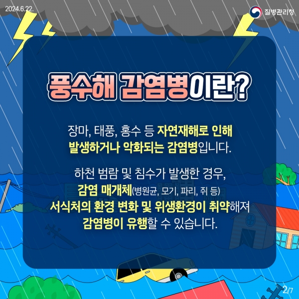 풍수해 감염병에는 오염된 물이나 음식 섭취로 인한 수인성·식품매개 감염병, 물웅덩이 등 모기 증식이 쉬운 환경으로 인한 모기매개 감염병, 오염된 물 등에 직접 노출로 인한 접촉성 피부염, 렙토스피라증, 안과 감염병 등이 있다.