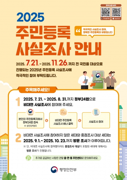 비대면 조사는 8월 31일까지 정부24앱으로 참여할 수 있으며 방문조사는 9월 1일 부터 10월 23일까지 비대면 미참여자 및 중점조사 대상으로 실시한다.