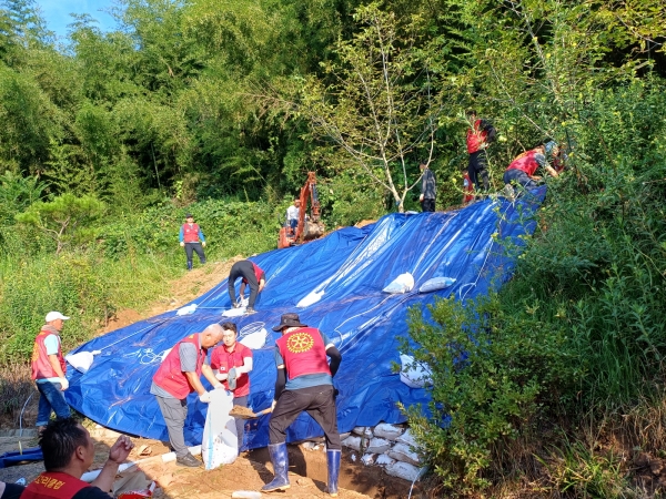 2일에는 △부여로터리클럽 회원들이 충화면 일원 주택 뒤편에 대량으로 쏟아져 내려온 토사를 굴착기 등 장비를 투입해 치우고 2차 피해를 막기 위해 천막을 덮어 단단히 고정하는 작업까지 마쳤다.