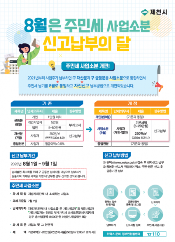 시 관계자에 따르면 지난 7월 1일을 기준으로 제천시에 주소를 둔 세대주는 주민세를 8월 16일부터 9월 1일까지, 사업소를 둔 개인과 법인은 주민세를 지난 8월 1일부터 오는 9월 1일까지 신고·납부해야 한다.