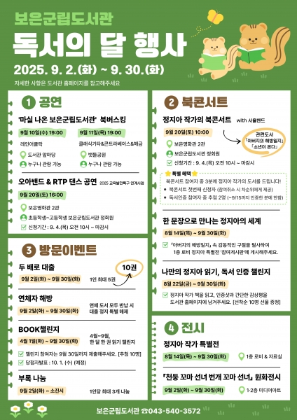 [충청뉴스큐] 보은군립도서관은 9월 ‘독서의 달’을 맞아 문학과 음악, 공연이 어우러진 특별한 무대를 준비한다고 26일 밝혔다.
