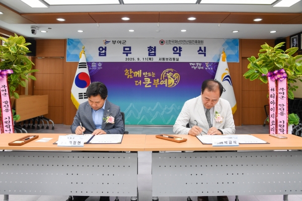 [충청뉴스큐] 부여군과 한국재난안전산업진흥협회는 지난 9월 11일 부여군청에서 상호협력과 신뢰를 바탕으로 군민의 삶의 질 향상과 각종 재난안전사고 예방을 위한 업무협약을 체결했다.
