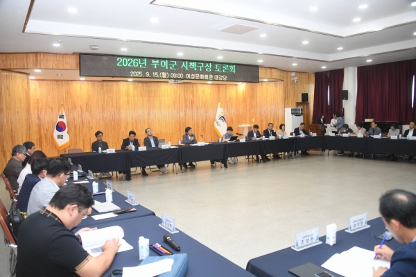 군은 지난 15일 부여군 여성문화회관에서 박정현 군수를 비롯해 부군수, 국·과·소장, 담당관, 분야별 외부 전문가 10여명 등 총 60여명이 참석해 ‘2026년 시책 구상 토론회’를 열고 각 부서에서 발굴한 신규 시책을 공유하는 자리를 가졌다.