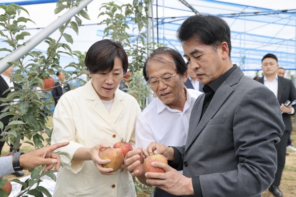 [충청뉴스큐] 보은군은 22일 송미령 농림축산식품부 장관이 보은군을 방문해 추석 성수품인 사과 생육 및 출하 현황을 점검하고 현장 관계자들을 격려했다.