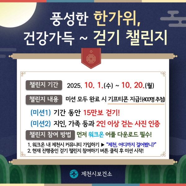 [충청뉴스큐] 제천시보건소는 추석 연휴를 맞아 시민의 걷기 실천을 돕기 위해 ‘풍성한 한가위, 건강가득 걷기 챌린지’를 운영한다.