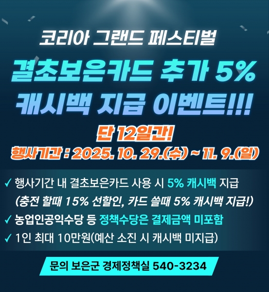 [충청뉴스큐] 보은군이 지역경제 활성화를 위해 결초보은카드 이용자에게 추가 5% 캐시백 혜택을 제공한다고 밝혔다.
