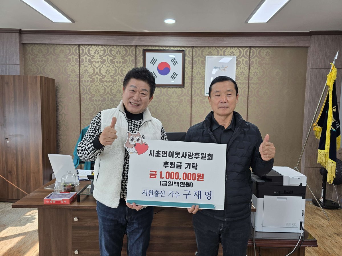 [충청뉴스큐] 서천군 시초면 출신 가수 구재영 씨가 지역의 취약계층을 돕기 위해 시초면이웃사랑후원회에 후원금 100만원을 기탁했다.