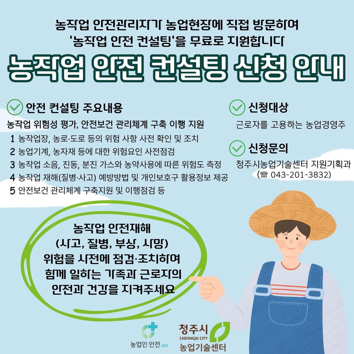 [충청뉴스큐] 청주시농업기술센터는 농작업 안전재해 예방 지원체계 구축사업의 일환으로 추진하는 ‘농작업 안전보건 컨설팅 지원사업’에 참여할 농업경영주를 2월 27일까지 모집한다.