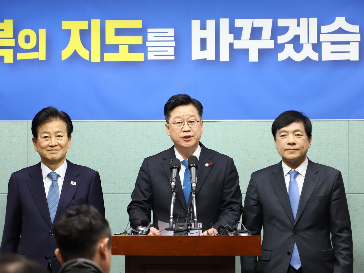 [충청뉴스큐] 전북도지사 출마를 선언한 안호영 국회 기후에너지환경노동위원장은 2일 기자회견을 열고 회견에 동석한 정동영 통일부 장관과 이성윤 더불어민주당 최고위원, 동참 의사를 밝힌 김윤덕 국토교통부 장관과 함께 전주·완주 행정통합을 추진하겠다는 입장을 밝혔다.