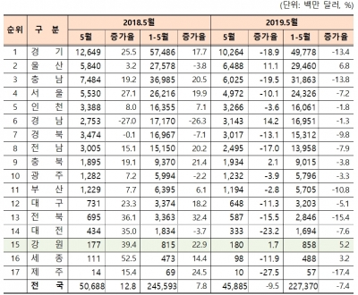 이와 같은 결과는 전국의 5월말까지의 수출 증가율이 –9.5%을 기록하며, 5개월 연속 마이너스를 기록하고 있는 상황에서 나온 것으로 그 의미가 매우 큰 것으로 판단된다.
