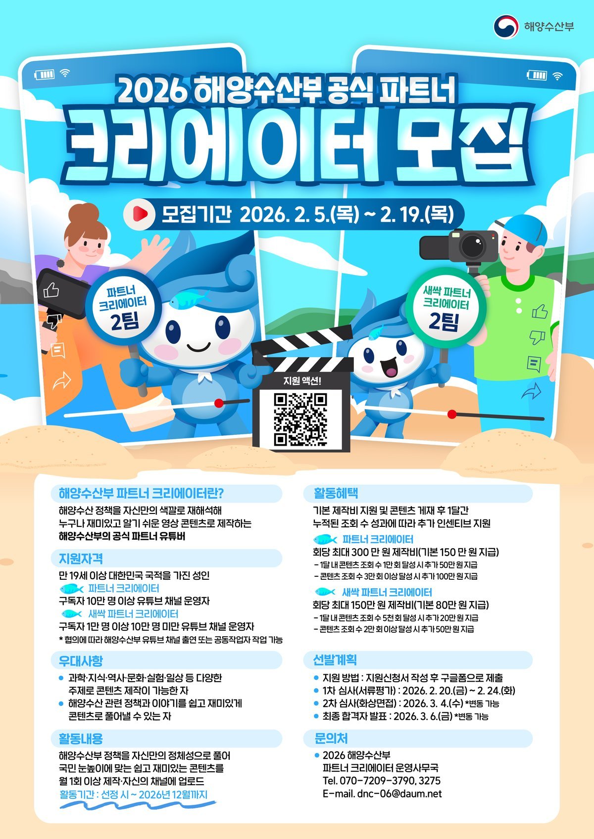 [충청뉴스큐] 해양수산부는 2026년 한 해 동안 해양수산 정책을 국민 눈높이에 맞춰 쉽고 재미있게 전달해 줄 ‘2026 해양수산부 공식 영상 협력 제작자’를 2월 5일부터 2월 19일까지 모집한다고 밝혔다.