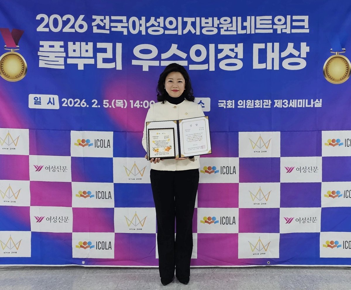 [충청뉴스큐] 천안시의회 유수희 의원이 전국여성지방의원네트워크가 주최한 '2026 풀뿌리 우수의정사례 공모'에서 생활정치 분야 우수상을 수상했다.