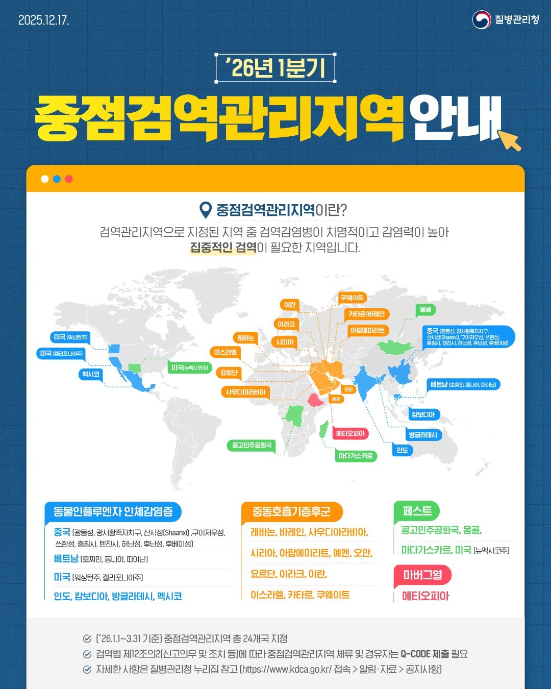 질병관리청은 해외감염병 발생 동향과 위험성 평가를 반영하여 총 24개국가를 중점검역관리지역으로 지정하여 운영하고 있으며, 해당 지역을 방문하거나 체류 후 입국하는 경우에는 Q-CODE 제출을 통해 검역관에게 건강상태를 신고하도록 하고 있다.