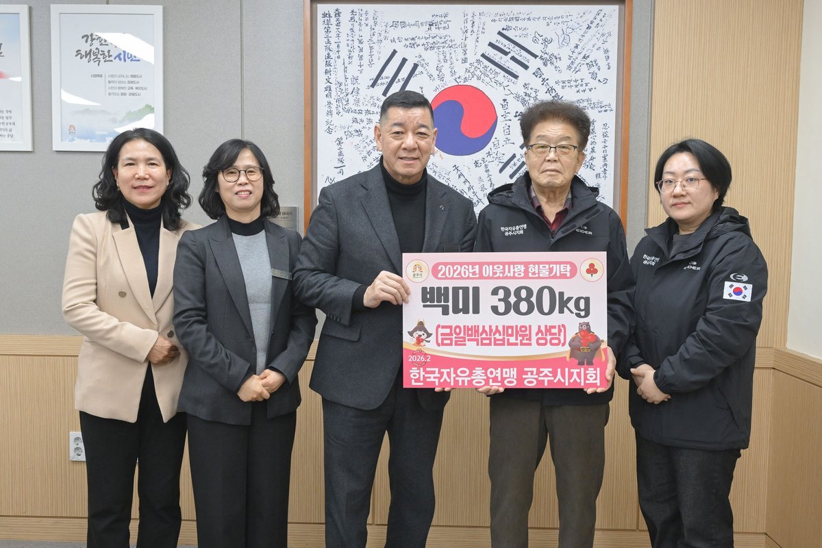 [충청뉴스큐] 공주시는 한국자유총연맹 공주시지회가 제14대 회장 취임을 기념해 백미 380kg을 기탁하며 따뜻한 나눔을 실천했다고 밝혔다.