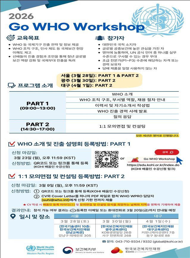 이번 워크숍은 3월 28일부터 4월 1일까지 서울, 광주, 대구에서 개최되며, 보건분야 국제기구 진출을 희망하는 대한민국 청년들에게 진출 관련 정보를 적극적으로 제공하기 위해 기획됐다.
