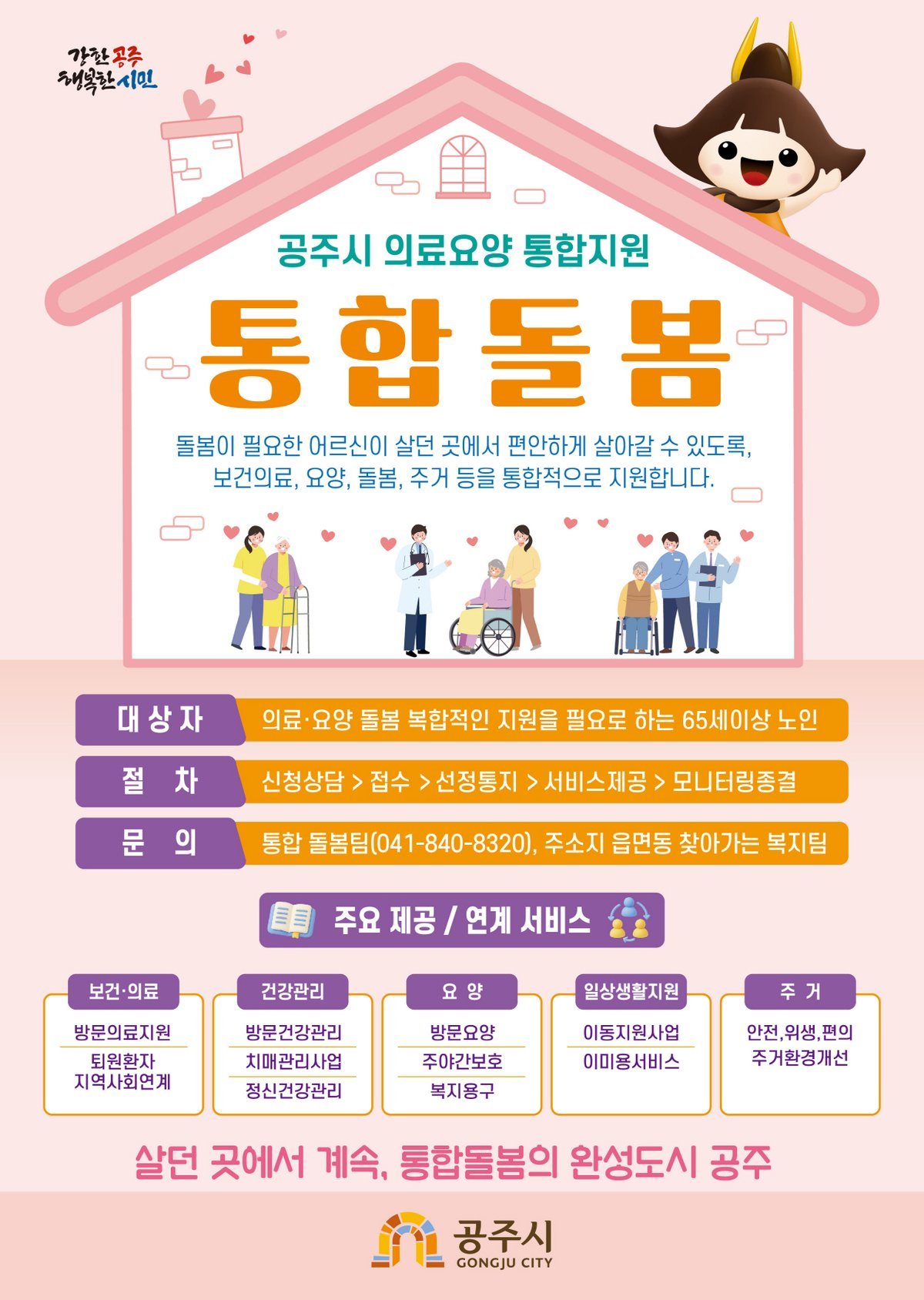 [충청뉴스큐] 공주시는 3월 27일부터 시행되는 ‘의료·요양 등 지역 돌봄의 통합 지원에 관한 법률’에 맞춰 개인별 맞춤 서비스를 제공하는 ‘지역 돌봄 통합 지원체계’운영을 본격화한다고 밝혔다.