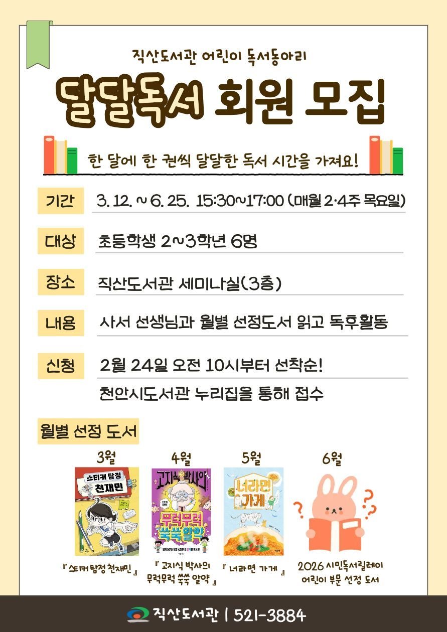 [충청뉴스큐] 천안시 직산도서관은 상반기 어린이 독서동아리 ‘달달독서’참여자를 모집한다고 23일 밝혔다.