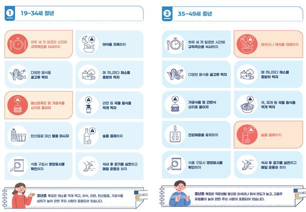 특히, 고혈압 위험이 큰 장년·노년 뿐만 아니라 청년, 중년 등 식생활에 소홀하기 쉬운 연령층에서도 선제적으로 활용할 수 있도록 ‘연령별 건강한 식생활 식사 지침’을 제시한다. 청년층은 야식, 패스트푸드 및 라면 등 섭취를 줄이고 탄산음료 대신 물 마시기를 권장하며, 중년층의 경우 외식·야식 자제와 술을 절제할 것을 권고한다.