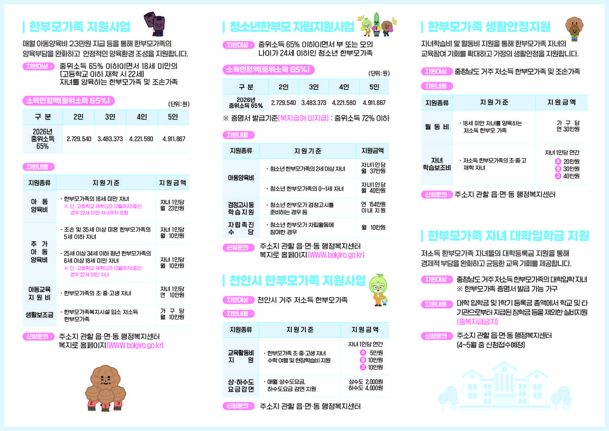이 외에도 △자녀학습비 및 월동비 지원 △취약·위기가족 사례관리 △한부모가족복지시설을 통한 보호 및 자립 지원 등 천안시와 정부가 추진하는 주요 복지 정보가 수록됐다.