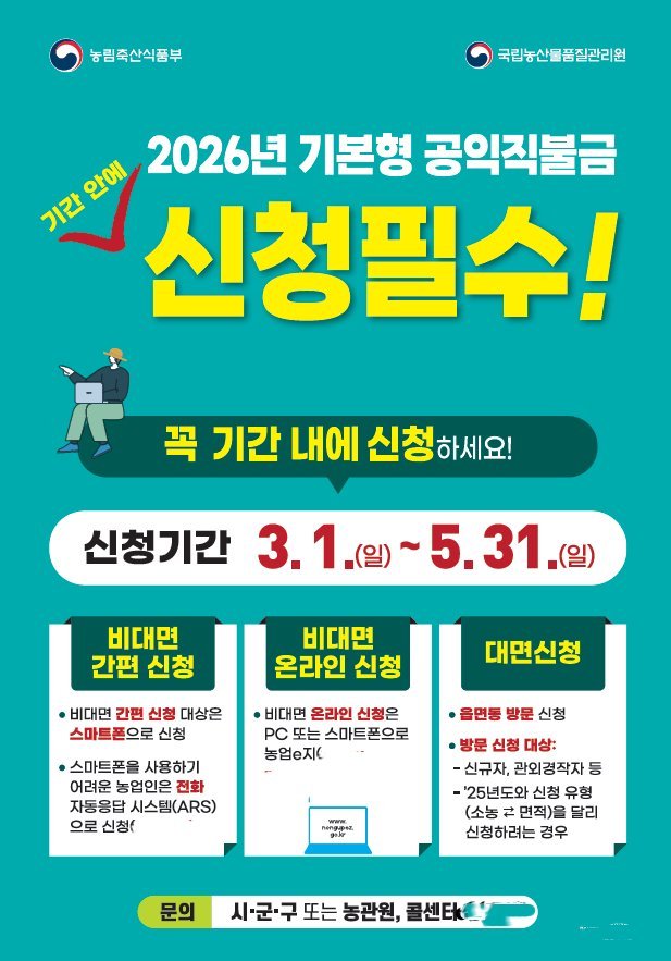 자세한 사항은 농지 소재지 면 동 행정복지센터, 공익직불제 통합콜센터로 문의하면 된다.