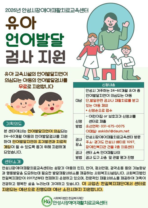 [충청뉴스큐] 안성시장애아재활치료교육센터가 지역 내 언어발달 지연이 의심되는 유아를 대상으로 조기 발견과 적기 치료를 돕기 위한 ‘무료 언어발달검사’를 지원한다.