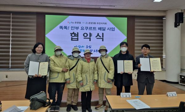 [충청뉴스큐] 아산시 온양3동 주민자치회는 13일 hy 온양점과 '똑똑, 요구르트 배달사업'추진을 위한 업무협약을 체결했다.