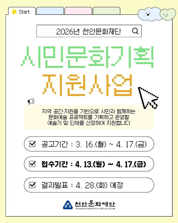 [충청뉴스큐] 천안문화재단은 다음달 13~ 17일 ‘시민문화기획 지원사업’참여 예술가를 모집한다고 16일 밝혔다.