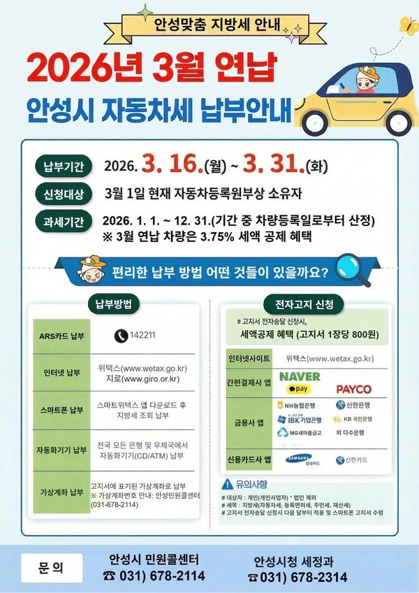 [충청뉴스큐] 시, 2026년 3월 연납 신청시 3.75% 세액공제 혜택 안성시가 지난 1월 자동차세 연납 혜택을 놓친 시민들을 위해 오는 3월 31일까지 ‘자동차세 3월 연납’신청을 받는다고 밝혔다.