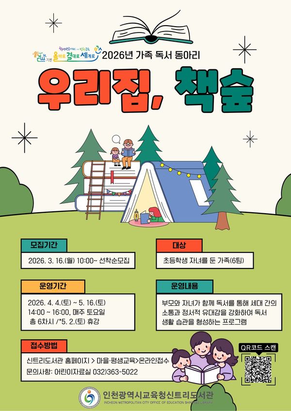 [충청뉴스큐] 인천광역시교육청신트리도서관은 3월 16일부터 초등학생 자녀를 둔 가족을 대상으로 독서동아리 ‘우리집, 책숲’참여자를 모집한다.