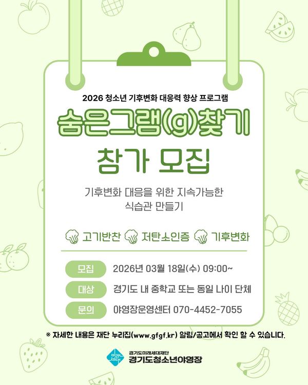 [충청뉴스큐] 경기도미래세대재단은 18일부터 기후변화 대응 체험형 교육 ‘숨은 그램 찾기’ 참가 단체·학교를 모집한다.