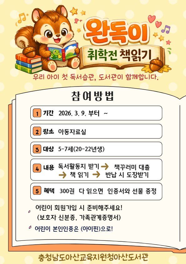 이번 사업은 5~7세 어린이를 대상으로 2026년 3월 9일부터 아산도서관 아동 자료실에서 운영하고 있다.