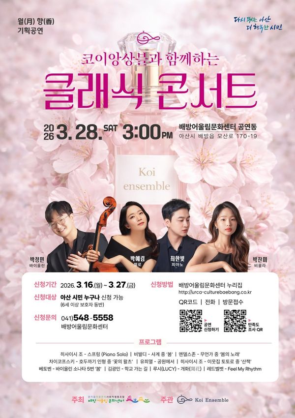 [충청뉴스큐] 아산시 배방어울림문화센터는 오는 3월 28일 오후 3시, 공연동에서 청년 음악가들로 구성된 ‘코이앙상블’의 클래식 콘서트를 개최한다고 밝혔다.