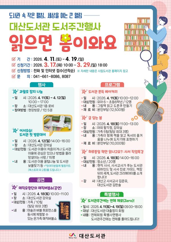 [충청뉴스큐] 서산시는 지역 주민의 도서관 이용을 활성화하고 도서관의 역할을 알리기 위해 오는 3월 17일부터 3월 29일까지 2026년 도서관주간 행사 읽으면 봄이 와요 수강생을 모집한다.