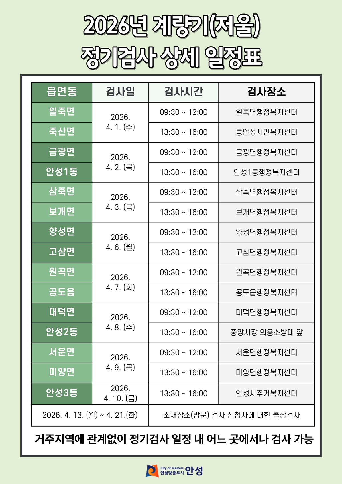 정기검사는 4월 1일부터 10일까지 읍 면 동 순회검사 방식으로 진행되며 검사 장소는 각 행정복지센터를 비롯해 안성시 주거복지센터와 안성중앙시장 등이다.